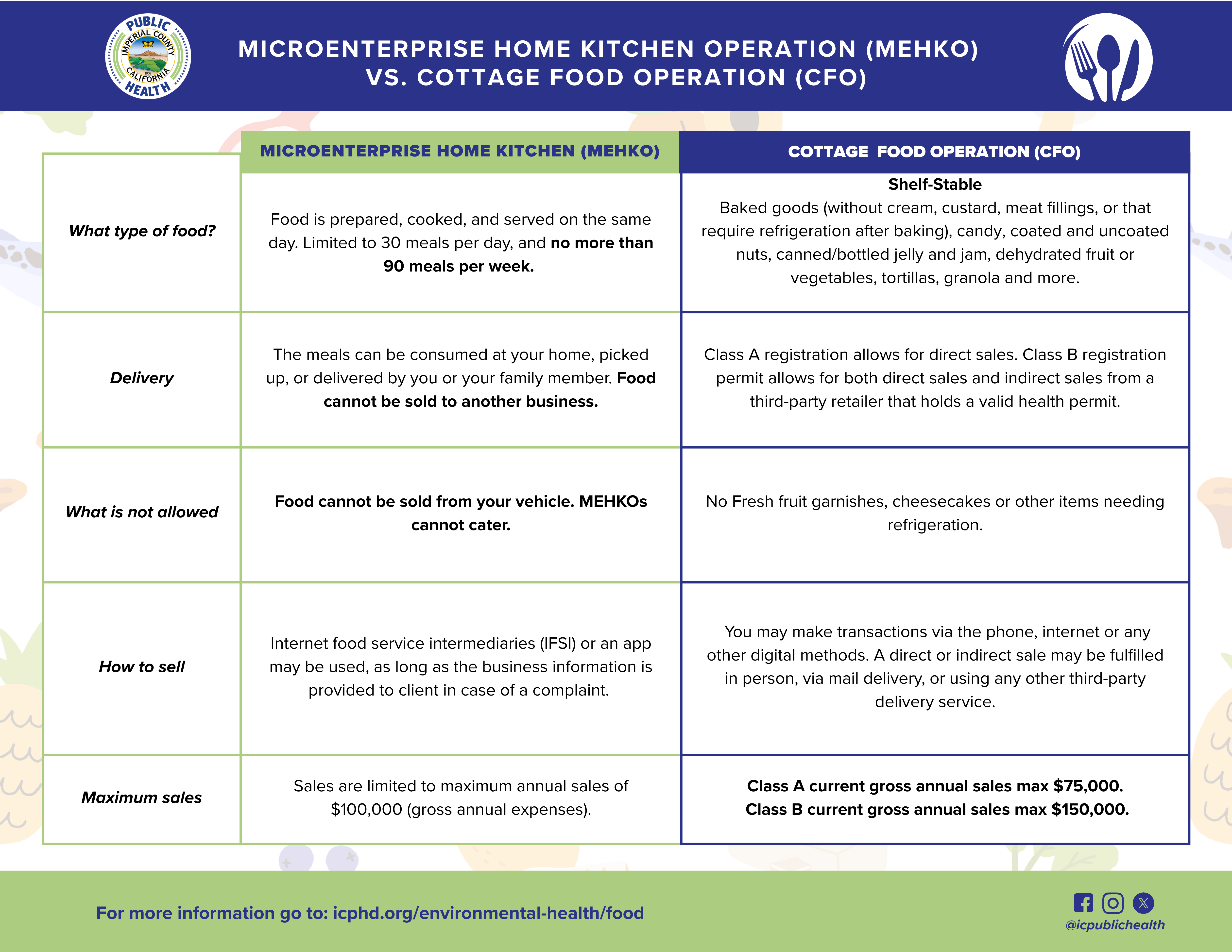 Review the tables below to see key differences between Microenterprise Home Kitchen Operation (MEHKO) vs. Cottage Food. Download this infographic for your reference. MEHKO vs. CFO Comparison PDF