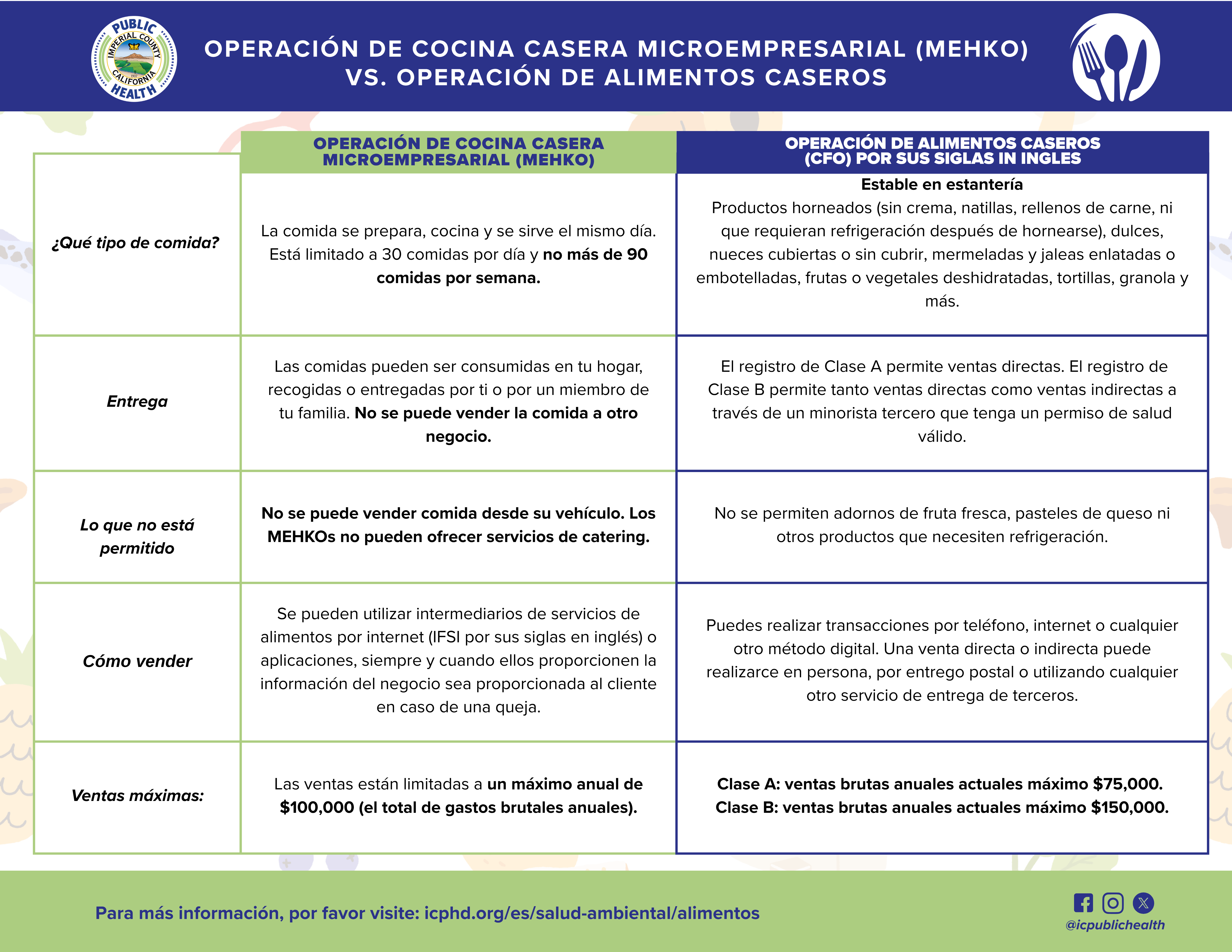 Revise las tablas a continuación para ver las diferencias clave entre una Operación de Cocina Casera Microempresa (MEHKO) y Alimentos Caseros (Cottage Food). Descargar esta infografía para su referencia comparativo: MEHKO vs. CFO PDF