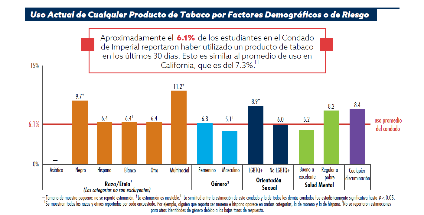 Este gráfico muestra el uso promedio actual de cualquier producto de tabaco en el condado según factores demográficos o de riesgo.